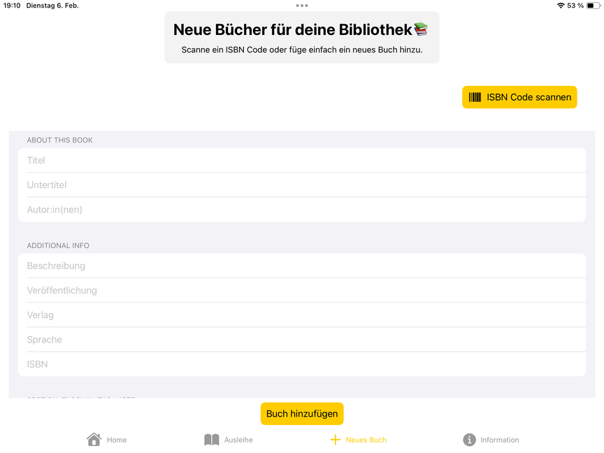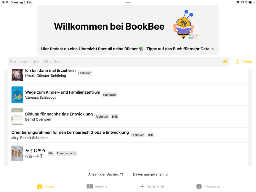 Mit BookBee 🐝 brauchst du für deine Bibliotheksverwaltung nichts weiter als ein Tablet, die BookBee App und das Wichtigste – einen Haufen spannender Bücher 📚. Manuelle oder über den ISBN Code automatische Erfassung deiner Medien, Kategorisierungen und der Möglichkeit, alle Ausleihen genau zu dokumentieren. Mit BookBee hast du nicht nur all deine Bücher stets im Blick. Du weisst auch immer ganz genau, welches Buch gerade von wem ausgeliehen ist 🔍